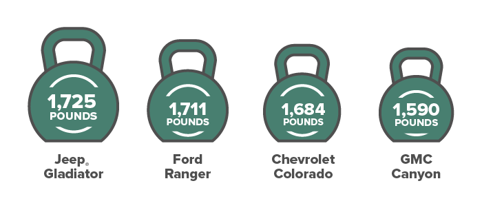 Achievable on Sport S models. Class based on Ward's Small Pickup segmentation. Based on the latest available competitor information. Max payload/towing ratings shown for base configuration. Additional options, equipment, passengers, and cargo weight may affect payload/towing weights. Contact dealer for details.